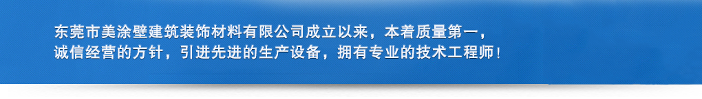 東莞市美涂壁建筑裝飾材料有限公司成立以來(lái),本著質(zhì)量第一,誠(chéng)信經(jīng)營(yíng)的方針,引進(jìn)先進(jìn)的生產(chǎn)設(shè)備,擁有專業(yè)的技術(shù)工程師,通過(guò)全公司員工